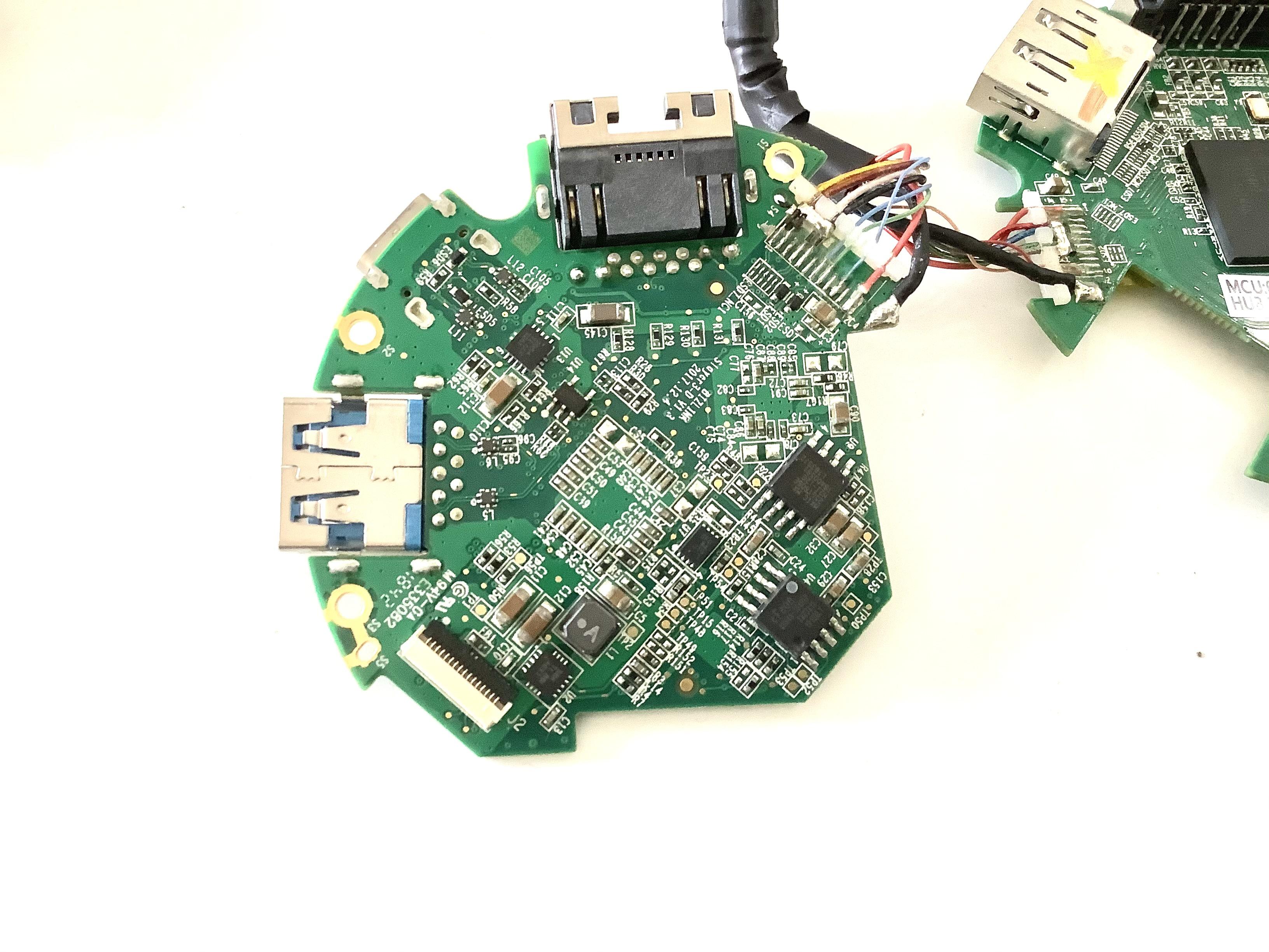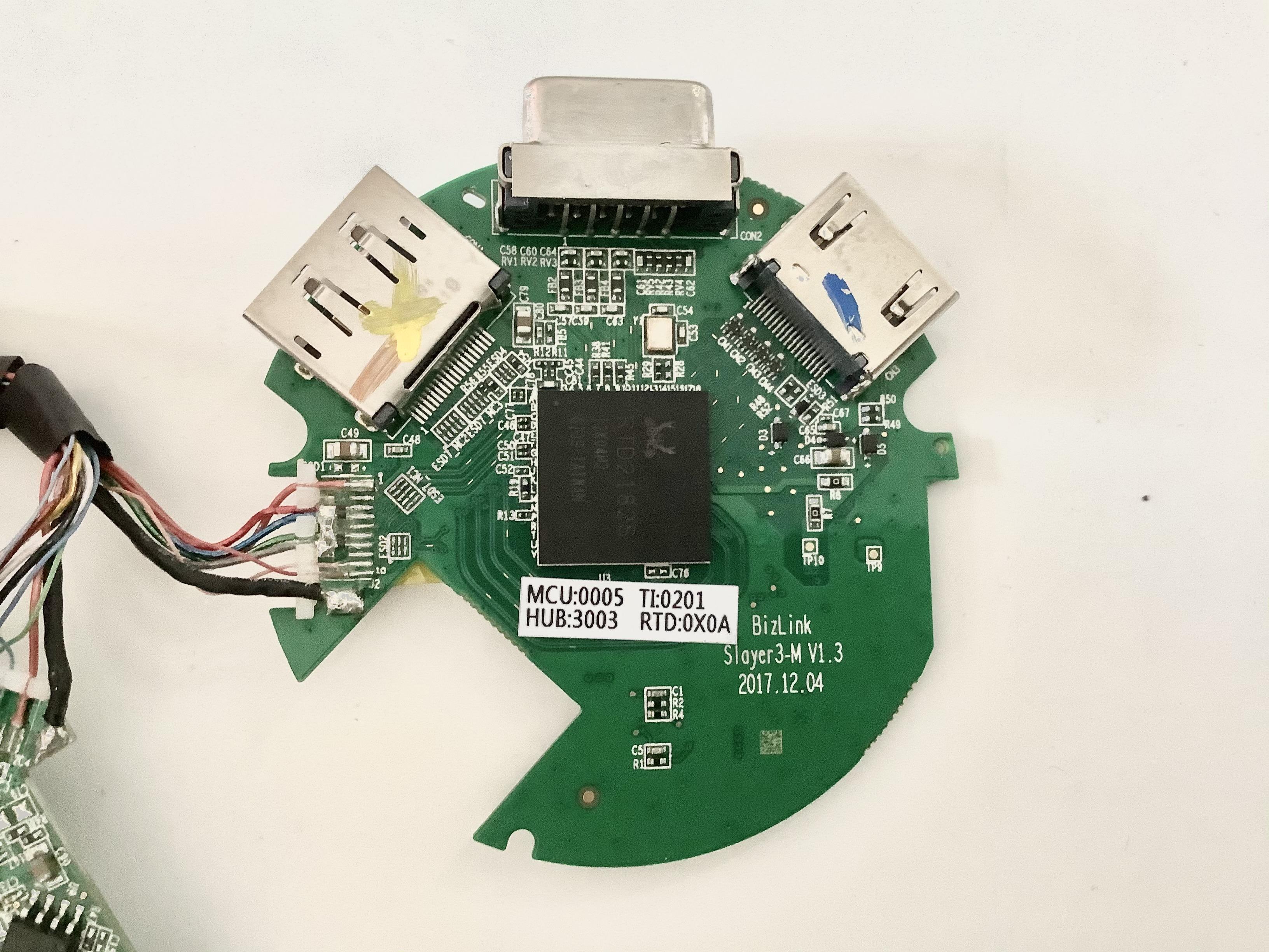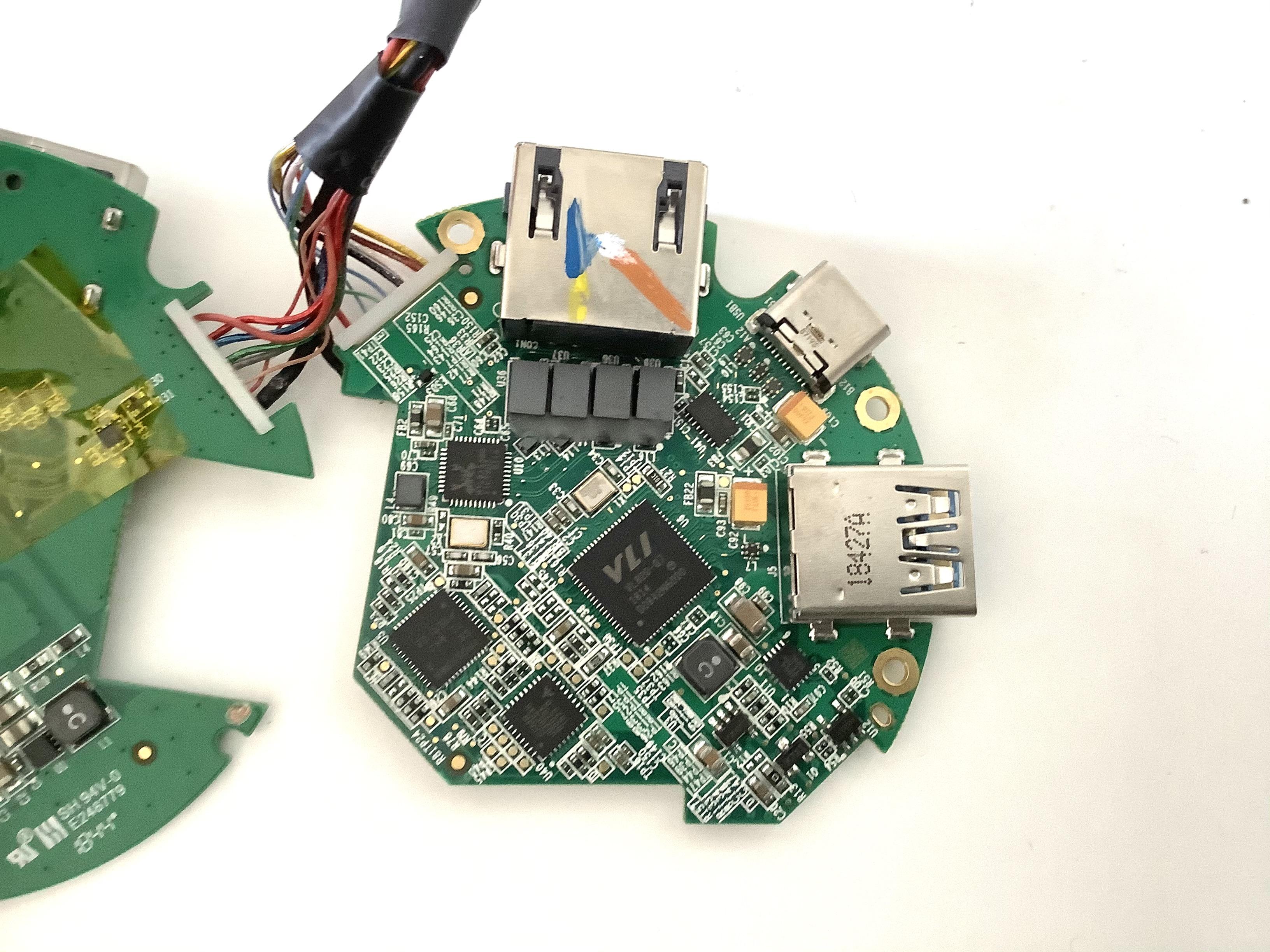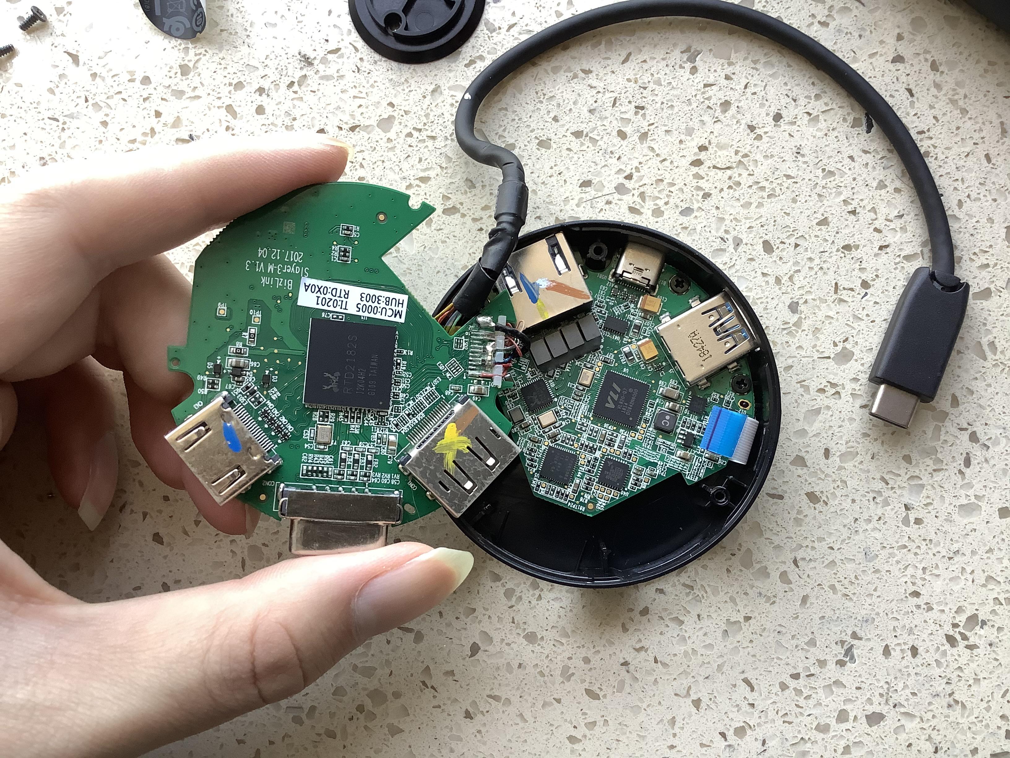 移出上层板,可以看到两块PCB的功能区别非常明确,靠底下的这一层有DP,HDMI,VGA接口,专用于视频信号输出,而另一层则有USB Type-C Type-A以及RJ-45,专用于数据类的链接