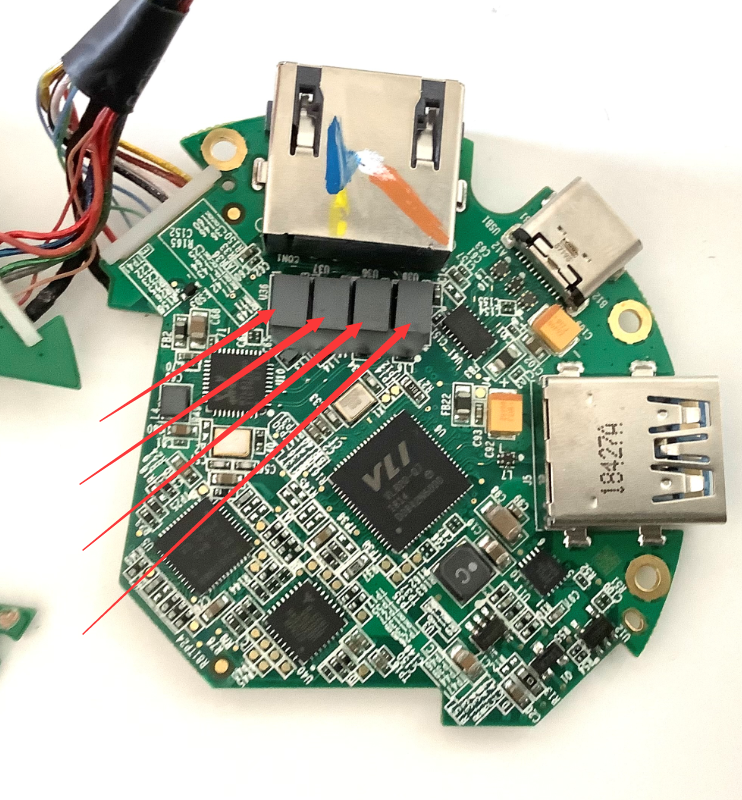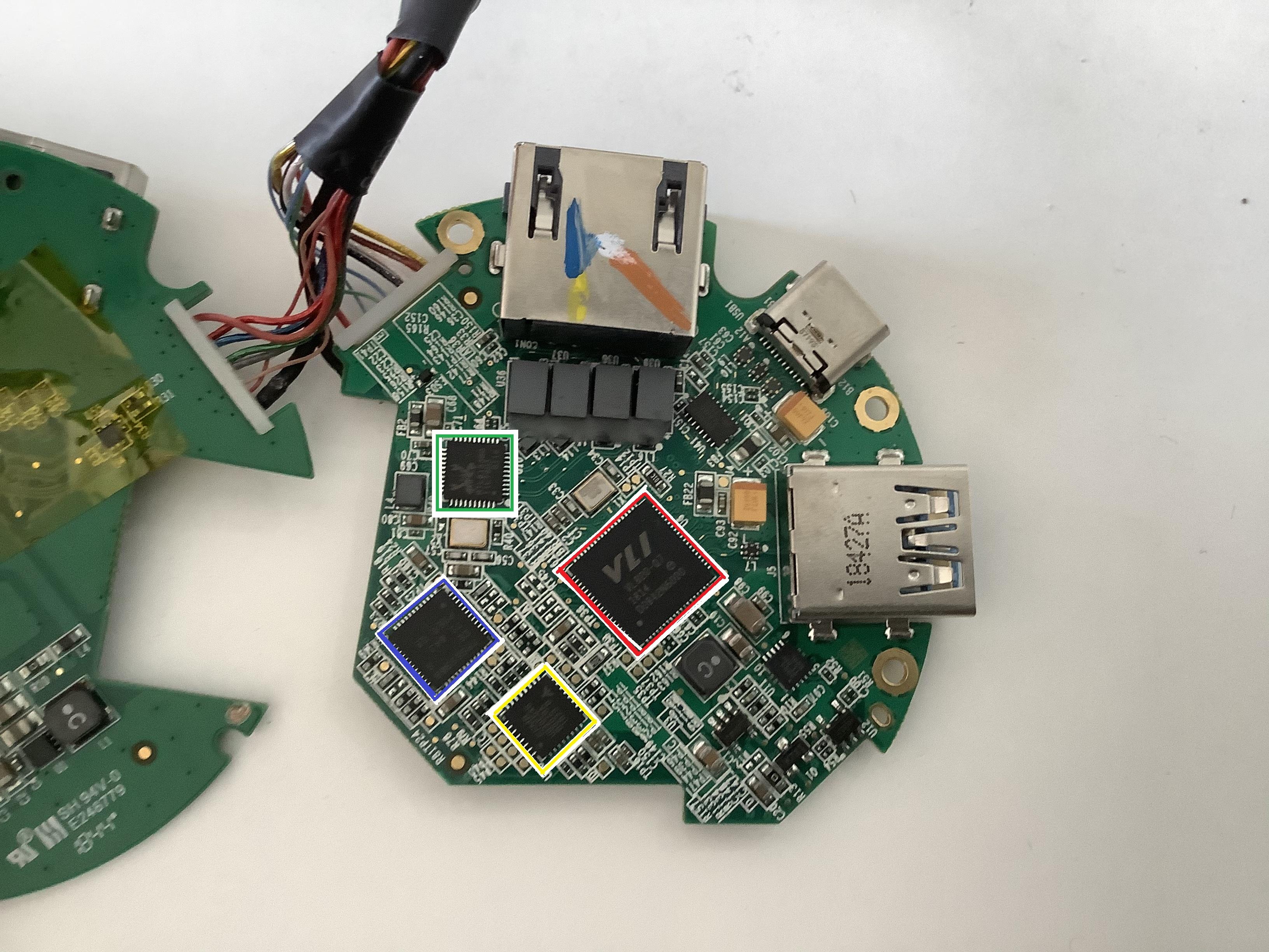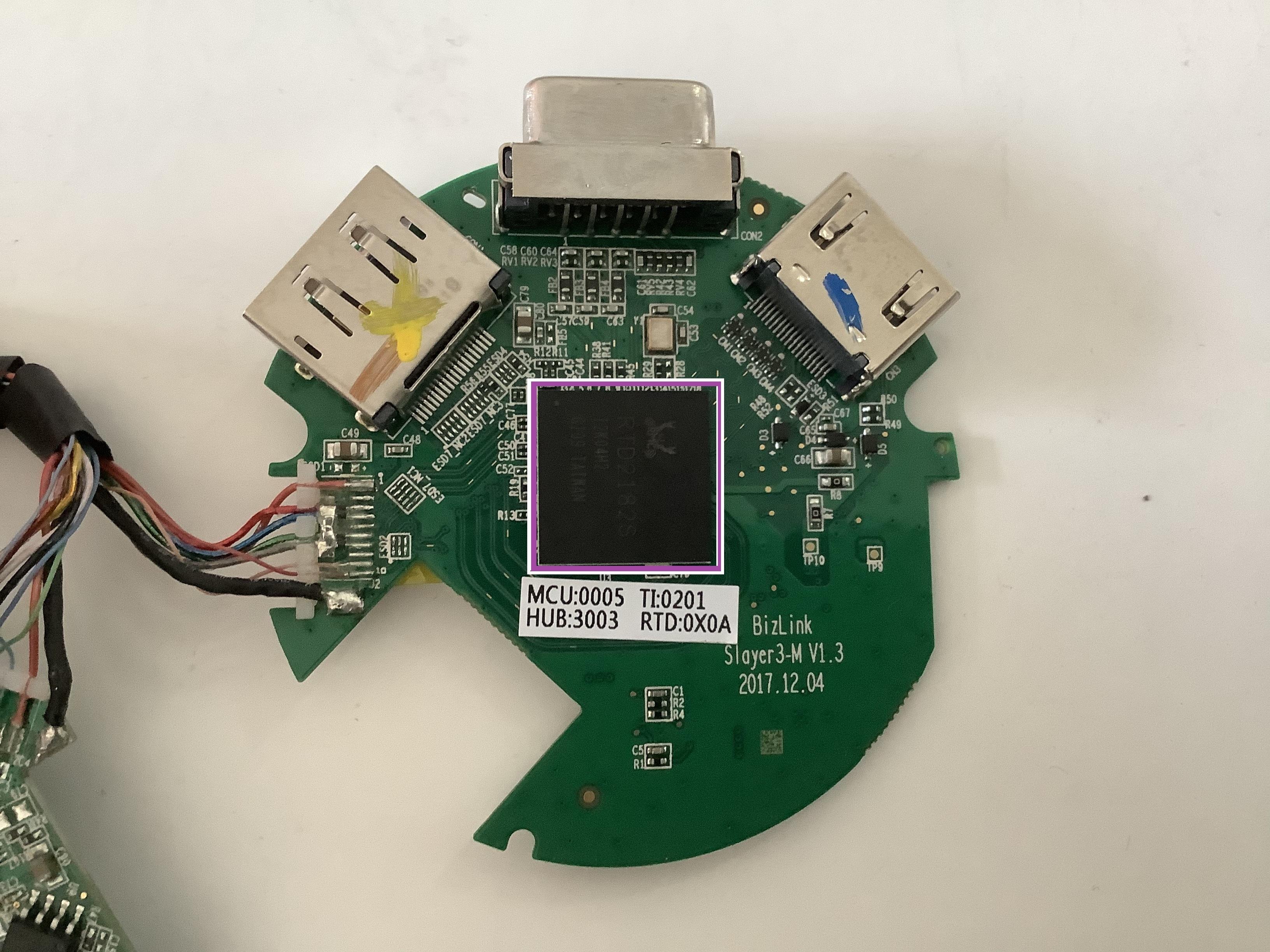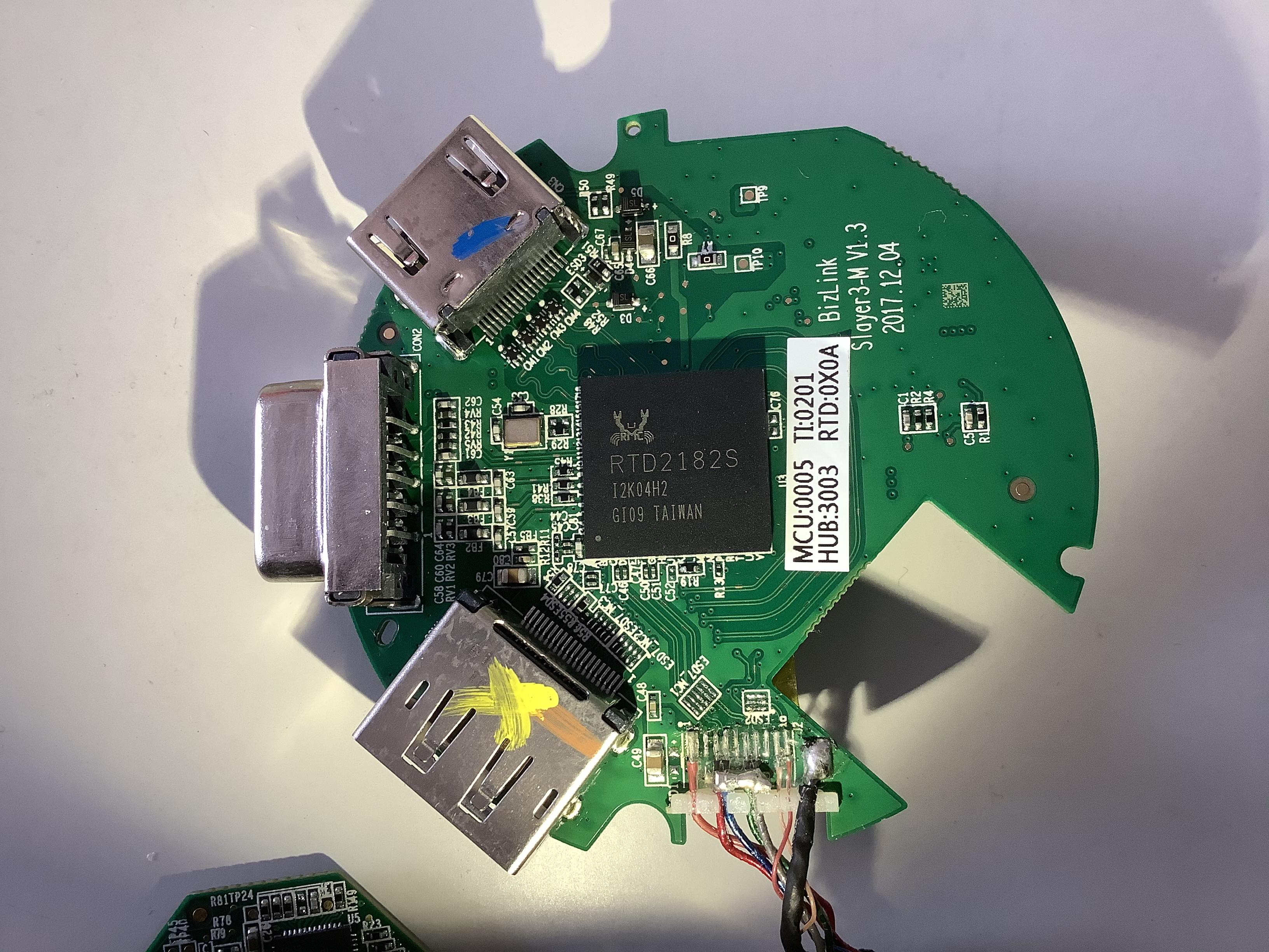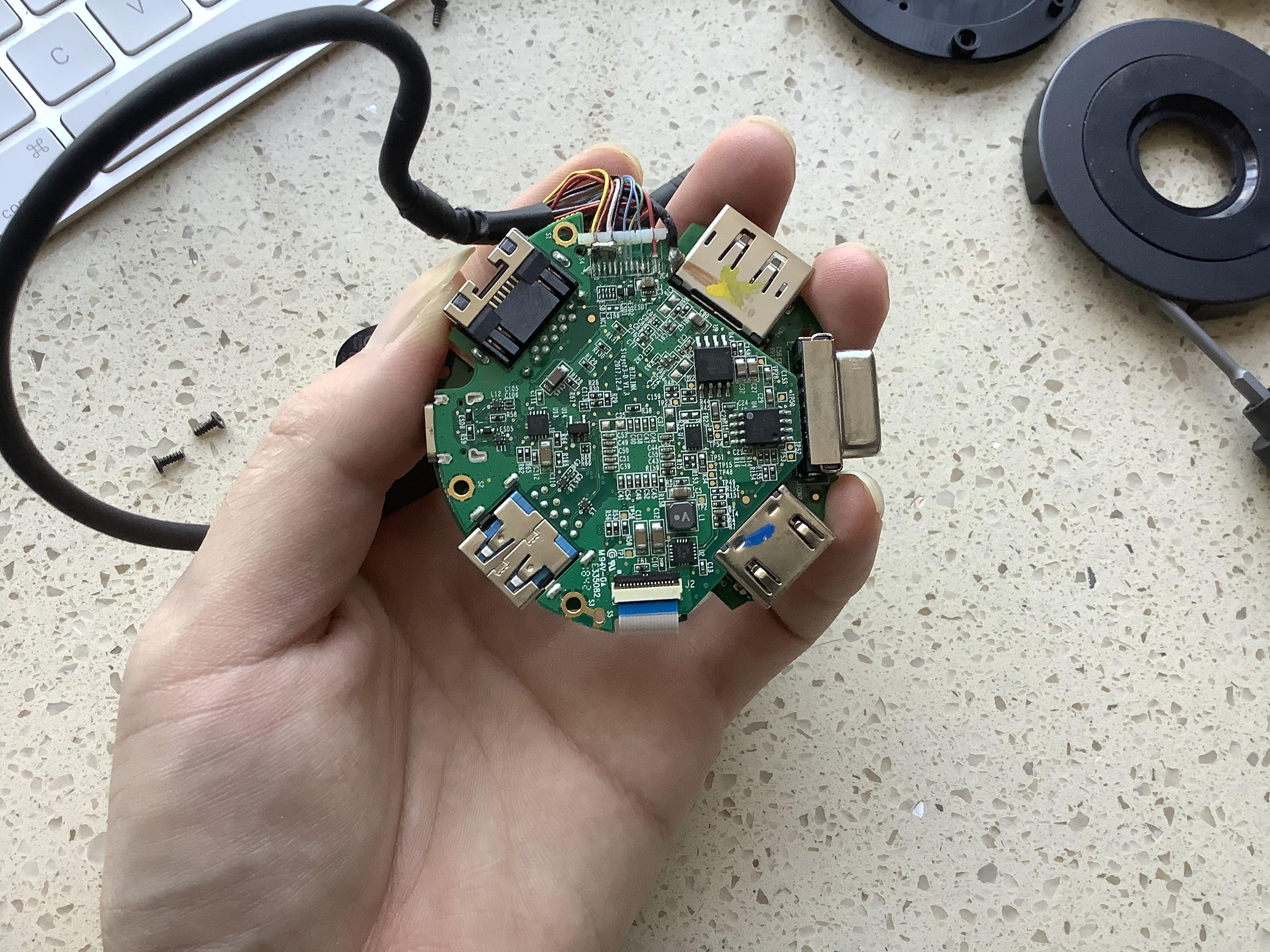 移出上层板,可以看到两块PCB的功能区别非常明确,靠底下的这一层有DP,HDMI,VGA接口,专用于视频信号输出,而另一层则有USB Type-C Type-A以及RJ-45,专用于数据类的链接